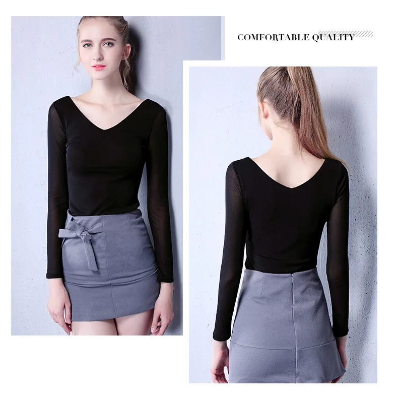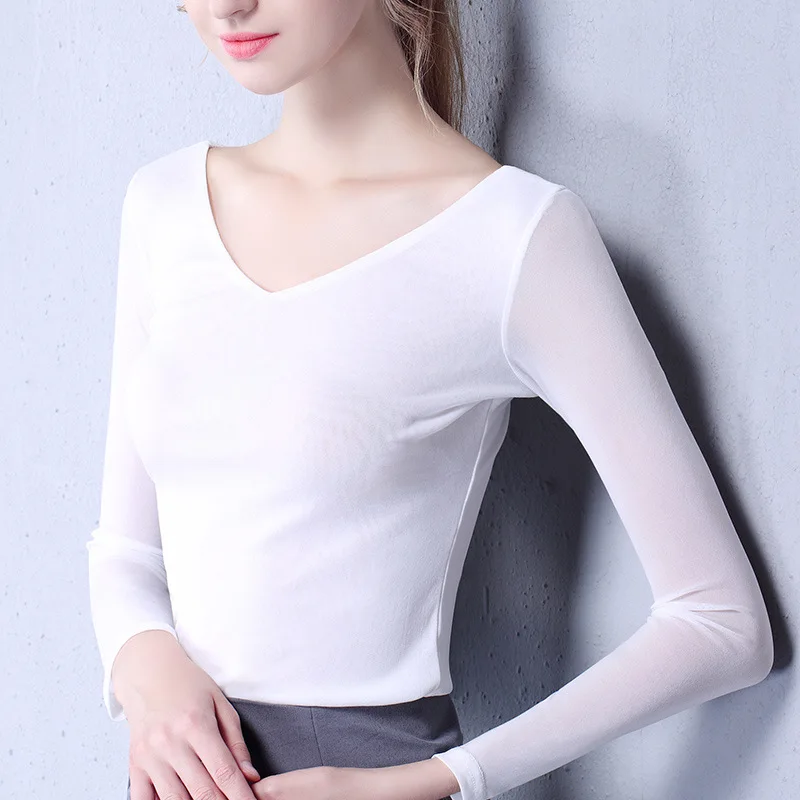 astounding Solid Sexy V-Neck Mesh Pullover Tshirt 2019 Spring Summer New Nylon Stretchy Slim Women Long Sleeve